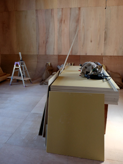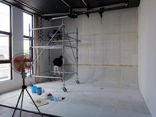 白ホリゾントスタジオの手前にある、「PRIVATE」の看板(写真右下)。このサインは2015年8月に惜しまれつつ閉館し解体され、建て替え工事がすすむ東京都港区虎ノ門にある「ホテルオークラ東京」旧本館で実際に使用されていたものです。縁があり、お分けいただきました。